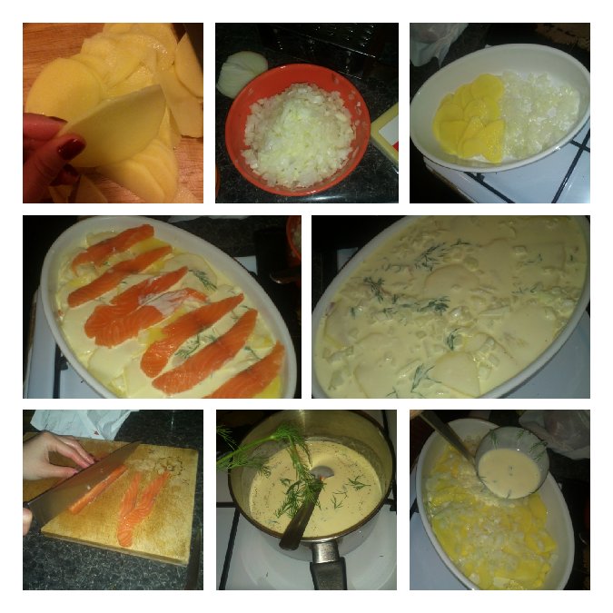 Place the potato slices, onions and salmon slices layer by layer, meanwhile pouring the cream over them. Eventually the potatoes need to be soaked by the cream( cream covers the surface preferably)