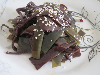 - 先將蒜頭香菜加入昆布和木耳絲, 攪拌好
