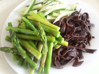 - 先將蘆筍和金菇用水略煲熟, 隔水待涼~(蘆筍變青綠色就行~煮太久會失去口感)