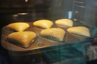 5. 分配放入預先塗上橄欖油的鬆餅焗盤~ 將一個有熱水的大焗盤放到最底格,放鬆餅盤中格焗 180度, 30~40分鐘~ 即成